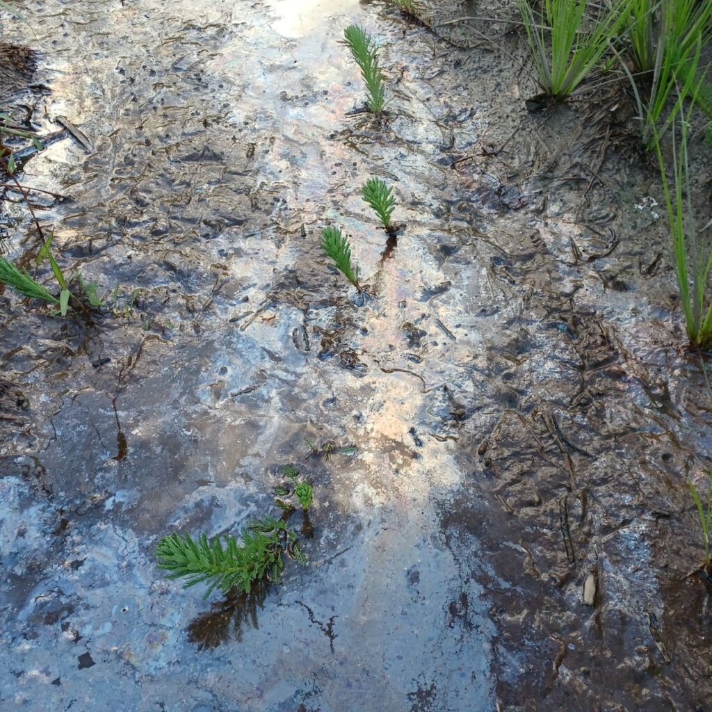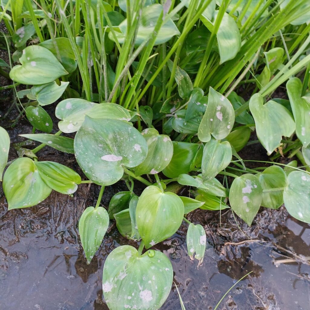 6月までに田んぼを綺麗にしたにも関わらず,特定外来植物ホテイアオイとオオフサモが次々に芽を出し、あっという間に群生状態になってしまいました。