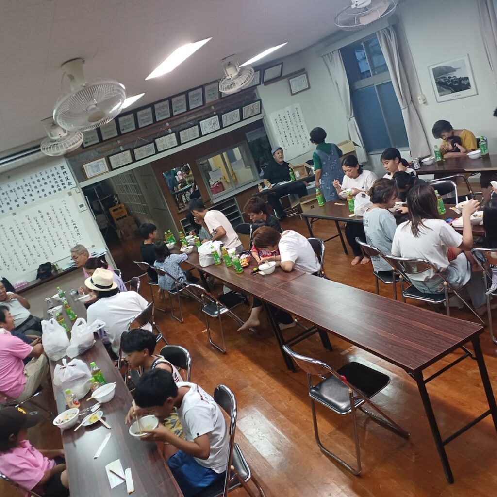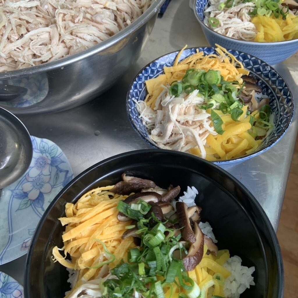 8月の龍郷・安木屋場ふれあい食堂は本龍郷開催。龍郷集落の有志の方々が鶏飯を作ってくださいました。
