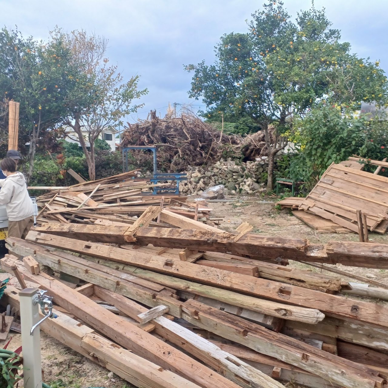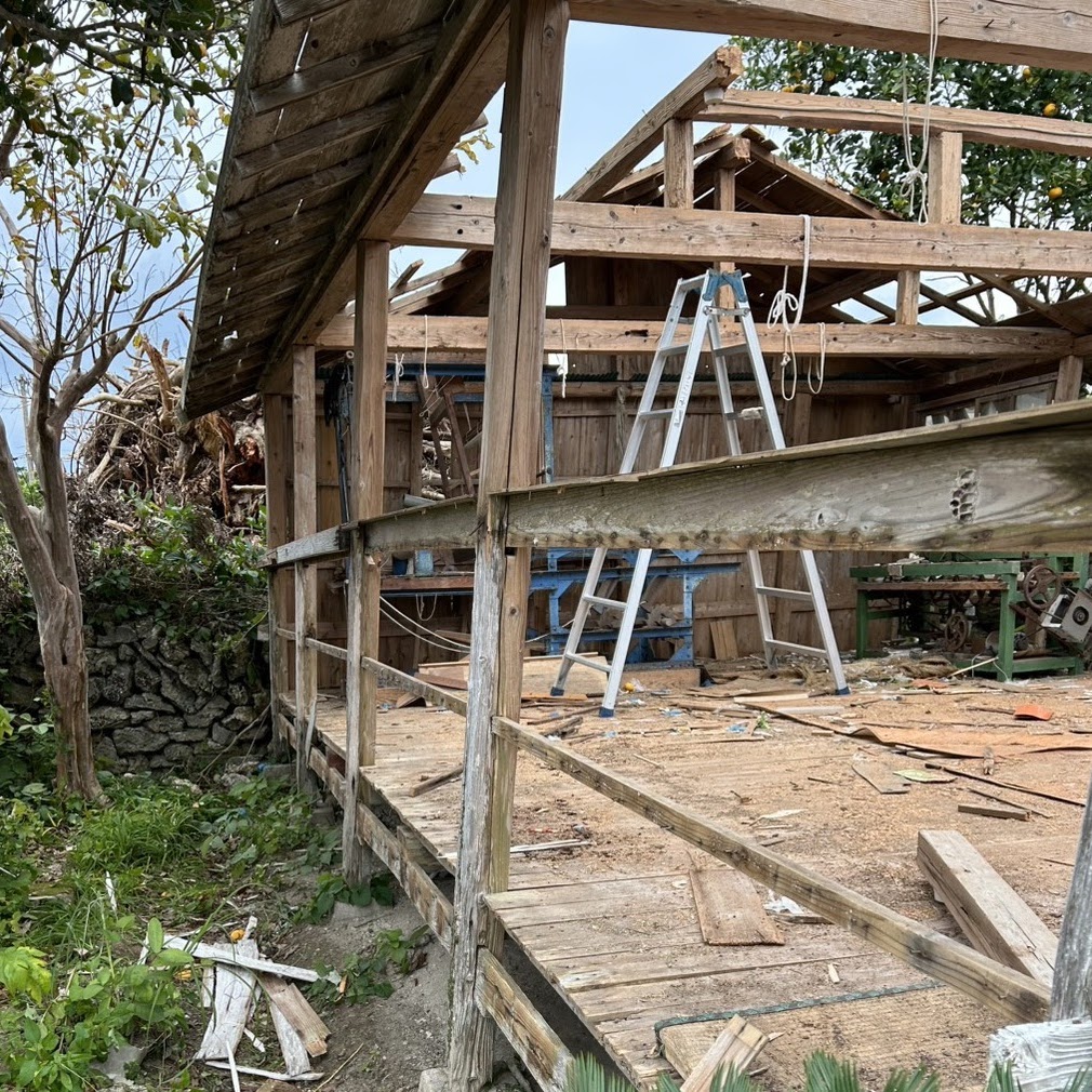 写真は、数年前の台風で傾いた危険倉庫(元大島紬工場)の解体作業の様子です。